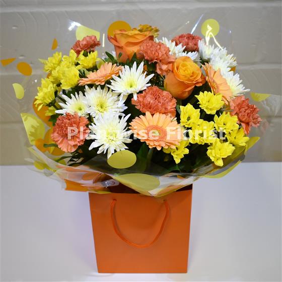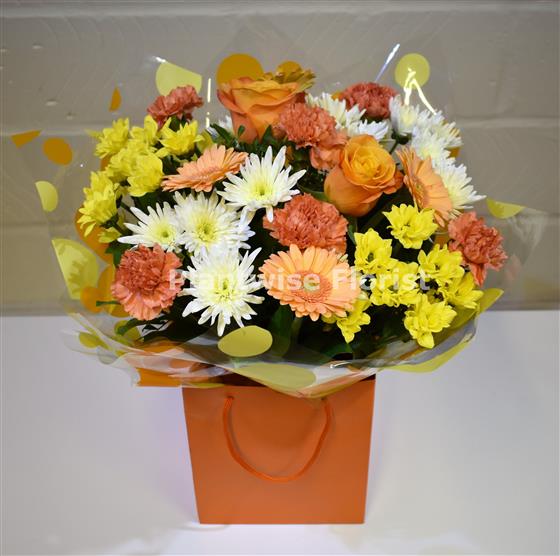 The bouquet is bursting with bright orange, yellow and cream flowers and includes Roses, Carnations, Germini, Chrysanthemums and mixed greenery, hand-tied and gift wrapped delivered in a water bubble placed into a orange gift bag for instant display.