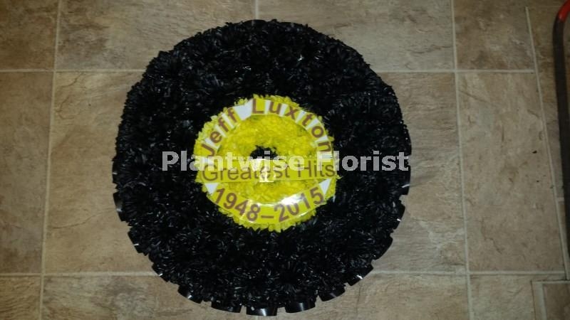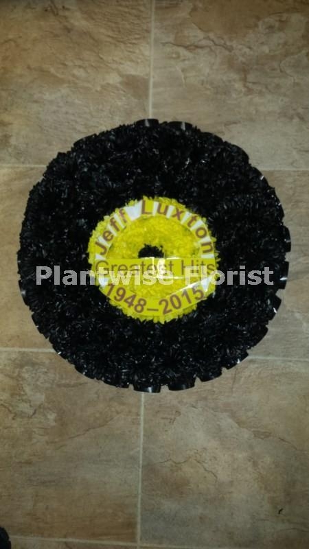 We have created a Record funeral wreath made in flowers which is a special funeral tribute to buy for someone's funeral that loved to play records, listen to music or was a DJ. The record can be personalised with their name, date of birth and date of passing if you wish. Just add that information to delivery instructions.