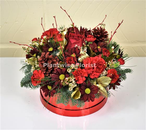 The Hat Box is bright metallic red in colour and filled with the most wonderful favourite Christmas Flowers Featuring Red Rose, Waxflowers, Chrysanths, Carnations, Spray Carnations with fragrant Christmas Pine, Pine Cones, Sparkly Red Birch and a dusting of gold glitter, a really special Christmas flower arrangement they will adore.