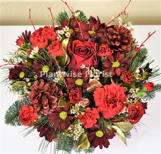 Please note These Christmas Flowers are hand made by Plantwise Florist in Canvey Island so can be ordered for Christmas flower delivery in SS8 Canvey Island, SS7 Benfleet, South Benfleet, Thundersley, New Thundersley, Daws Heath, Hadleigh, SS13 Pitsea or Bowers Gifford in Essex or can be collected in store free of charge on any day you wish before Christmas.