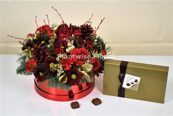 A Really special Christmas flower arrangement designed in a stunning hat box with delicious Chocolates too is what makes this gift really special and a florist favourite.