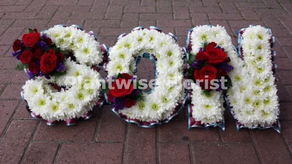SON Floral Letters Tribute Wreath with Full Clusters. Each letter is based in Double Chrysanths and a Cluster of Roses, Spray Carnations and Choice Foliage is arranged onto each letter. Finished with a matching ribbon edge.