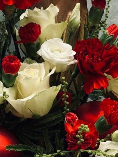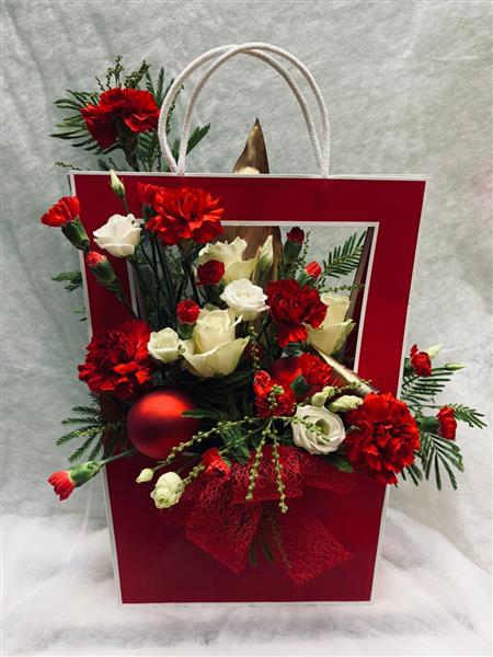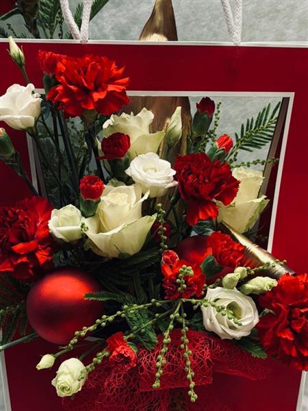 This festive arrangement is beautifully presented in a red gift bag adorned with elegant baubles. The arrangement features a stunning blend of red and white blooms, creating a striking contrast. You can personalise by choosing your favorite colours to make it truly unique and special for this festive season.