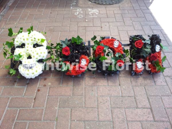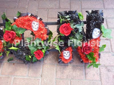 The Skull and Floral letters have been all been created with Gothic black and red flowers with rambling ivy and red roses to give a dramatic effect to this gothic designed funeral tribute.