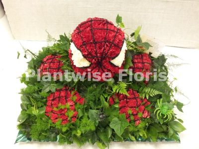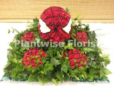 We have designed a 3D Spiderman Character funeral flower Wreath. Spiderman has been made in red flowers and he appears to be coming out of the greenery which gives a really great effect.