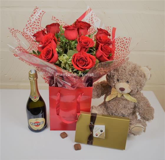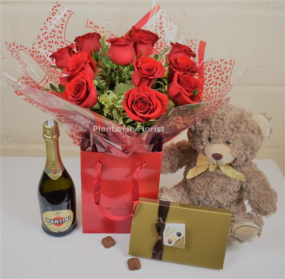 Plantwise Florists Extra Special Valentine Day Gift Set of 12, 18 or 24 Red Roses Bouquet with Prosecco, Chocolates and Teddy Bear can be ordered for Same day delivery on Valentines day in Canvey Island, Benfleet, Thundersley, Hadleigh, Pitsea, Basildon, Bowers Gifford in Essex on Valentine's day or Free in store collection.