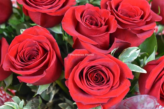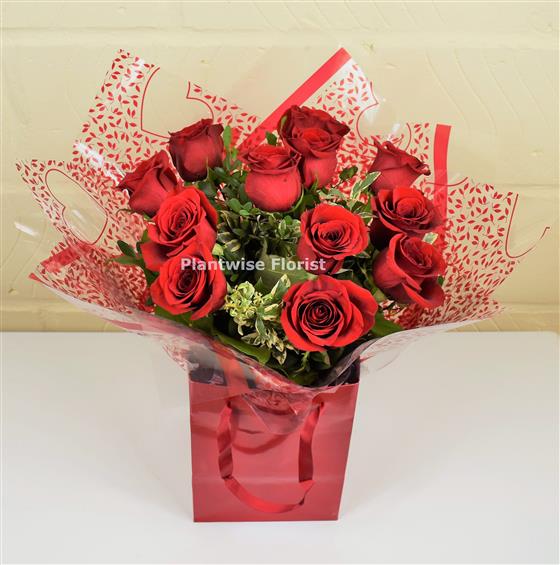 Plantwise Florist Best selling Romantic Valentine's day bouquet of a Dozen 12 Red Roses with Mixed Greenery is hand-tied and delivered in a water bubble with Valentine gift wrapping delivered in a red gift bag for instant display, to buy for your Girlfriend, Wife, Husband or Boyfriend to say I love You delivered on Valentines Day.