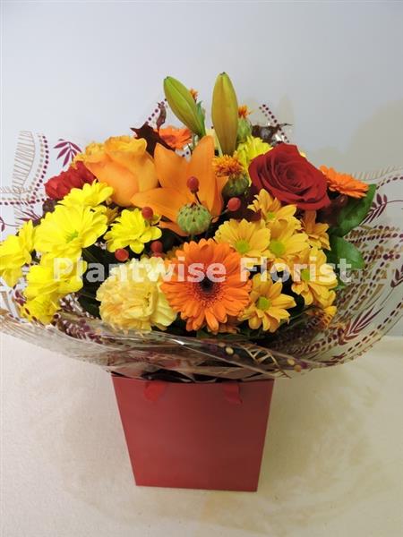 Plantwise Florist have arranged seasonal autumn flowers to create our Autumn Breeze bouquet of flowers which includes Germini, Lily, Roses, Hypercium Berries, Carthamus, Chrysanthemums and Carnations with beautiful greenery carefully hand-tied finished with autumn gift wrapping and delivered in water and placed into a red gift bag making this a great bouquet to buy for any occasion.